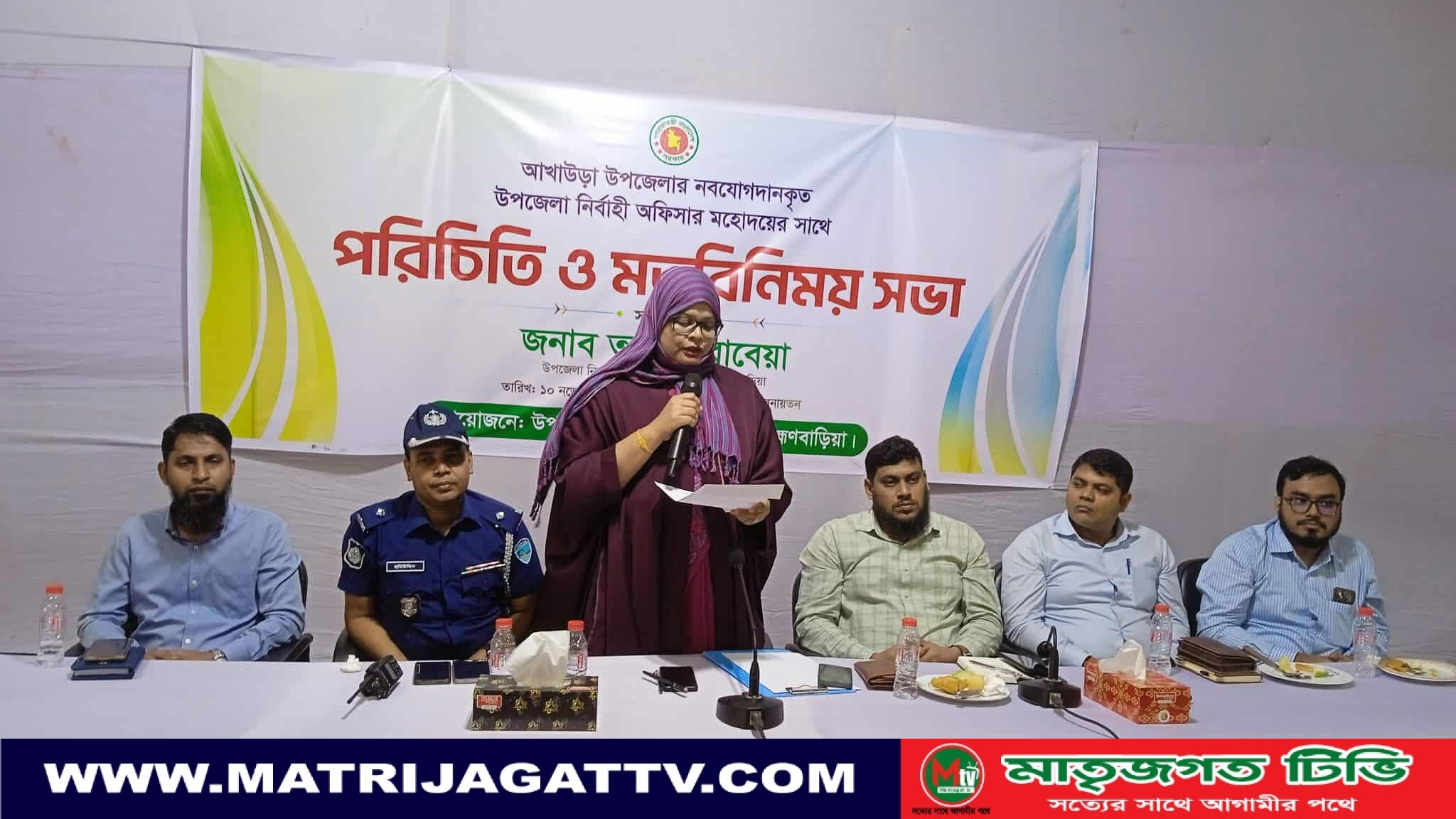 মোঃ রাশেদ আল শাহরিয়া (স্টাফ রিপোর্টার) আখাউড়া (ব্রাহ্মণবাড়িয়া), ১০ নভেম্বর ২০২৫ আজ সকাল ১০টায় আখাউড়া উপজেলা মিলনায়তনে নবাগত উপজেলা নির্বাহী অফিসার (ইউএনও) তাপসী রাবেয়া-এর সঙ্গে মুক্তিযোদ্ধা, সাংবাদিক, রাজনৈতিক নেতৃবৃন্দ, সুশীল সমাজের প্রতিনিধি ও বিভিন্ন শ্রেণি-পেশার মানুষের পরিচিতি ও মতবিনিময় সভা অনুষ্ঠিত হয়েছে। সভায় সভাপতিত্ব করেন ইউএনও তাপসী রাবেয়া। তিনি বক্তব্যে বলেন, “আখাউড়ার সার্বিক উন্নয়ন, সুশাসন ও জনসেবার মানোন্নয়নে প্রশাসন ও জনগণের মধ্যে পারস্পরিক সহযোগিতা অপরিহার্য। আমি চাই সবাই মিলে একটি সুন্দর, স্বচ্ছ ও উন্নত আখাউড়া গড়ে তুলতে।” অনুষ্ঠানে উপজেলার মুক্তিযোদ্ধা, জনপ্রতিনিধি, সাংবাদিক, শিক্ষক, রাজনৈতিক নেতৃবৃন্দ ও বিভিন্ন পেশাজীবী ব্যক্তিবর্গ উপস্থিত ছিলেন। তারা নবাগত ইউএনওকে স্বাগত জানিয়ে তাঁর কর্মজীবনে সফলতা কামনা করেন এবং উপজেলার উন্নয়ন অগ্রযাত্রায় সকলে একসঙ্গে কাজ করার অঙ্গীকার ব্যক্ত করেন। পরিচিতি ও মতবিনিময় সভাটি প্রাণবন্ত ও সৌহার্দ্যপূর্ণ পরিবেশে অনুষ্ঠিত হয়।