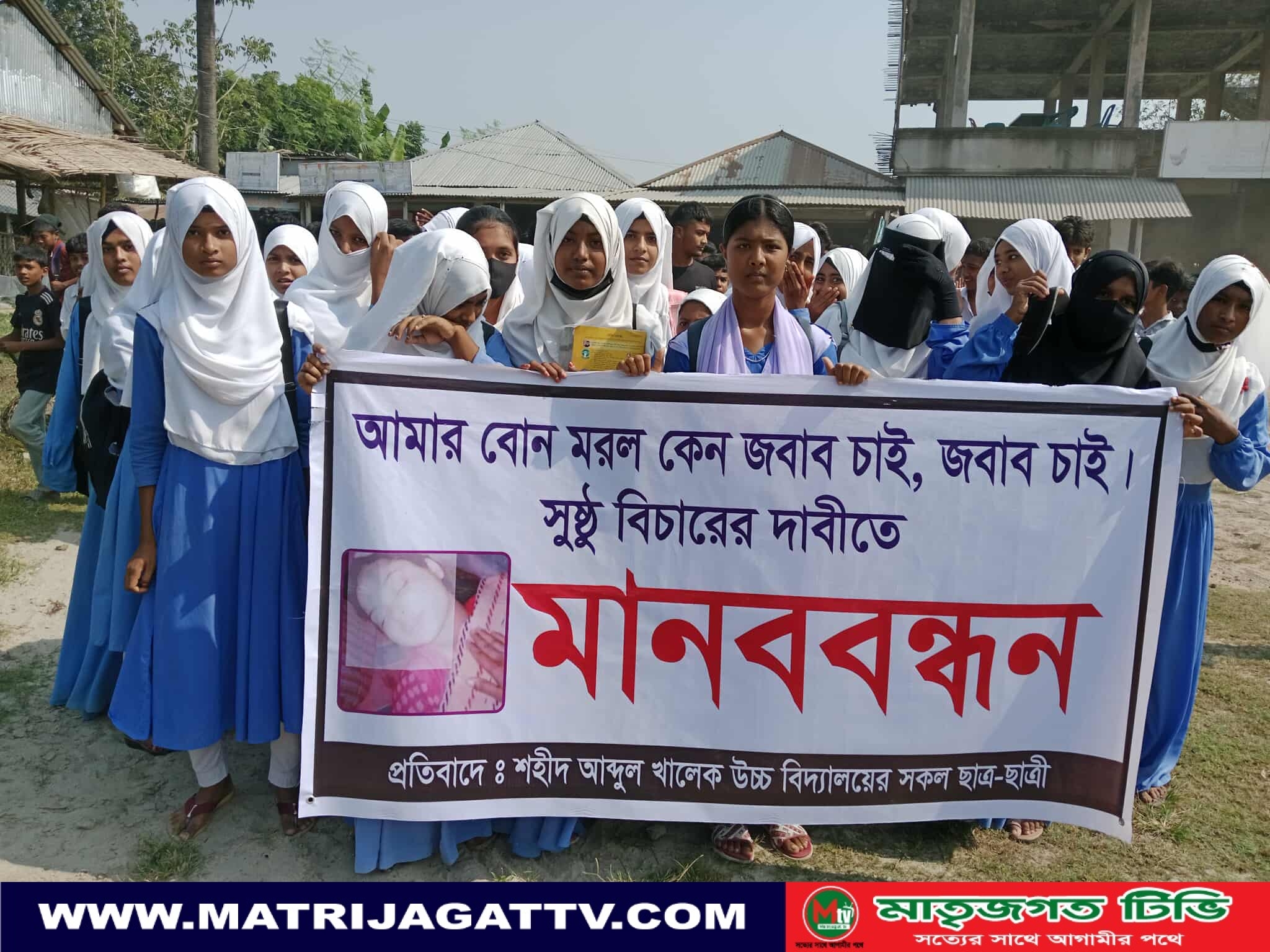পাবনা জেলা প্রতিনিধি: "আমার বোন মরল কেন? বিচার চাই, সুষ্ঠু বিচার ও শিক্ষকের পদত্যাগের দাবিতে বিক্ষোভ মিছিল ও মানববন্ধন করেছেন শহীদ আব্দুল খালেক উচ্চ বিদ্যালয়ের শিক্ষার্থীরা। আজ সোমবার ১০ নভেম্বর সকাল নয়টা থেকে বিদ্যালয় প্রাঙ্গণে শিক্ষিকার বিচারের দাবিতে মানববন্ধন, বিক্ষোভ মিছিল করেছে শিক্ষার্থীরা । বিক্ষোভ মিছিলটি খিদিরপুর বাজারের প্রধান প্রধান সড়ক প্রদক্ষিণ করে বিদ্যালয়ের প্রধান ফটকের সামনে টায়ার জালিয়ে অভিযুক্ত শিক্ষকের পদত্যাগ দাবি করেন শিক্ষার্থীরা। এবং প্রশাসনের আশ্বাসে শিক্ষার্থীরা কর্মসুচি স্থগিত করেন এবং মানববন্ধন শেষ করেন। তবে এর সুষ্ঠু বিচার না হলে পরবর্তীতে কঠোর আন্দোলন ঘোষণা দেন শিক্ষার্থীরা। ঘটনার বিবরণ সূত্রে জানা গেছে, মোবাইল ফোন রাখার অপরাধে দুই শিক্ষকের বিরুদ্ধে ৯ম শ্রেণির শিক্ষার্থী জেসমিন আক্তার জেমিকে ডেকে নিয়ে কমনরুমে আটকে রেখে বেধরক মারপিট ও বেত্রাঘাত করা হয়েছে বলে অভিযোগ উঠেছে।এঘটনার পরিপেক্ষিতে ওই ছাত্রী অপমান সহ্য করতে না পেরে ঘটনার এক সপ্তাহ পরে রবিবার ৯ নভেম্বর সকাল সাড়ে আটটার সময় রাজশাহী মেডিকেল কলেজ হাসপাতালে চিকিৎসাধীন অবস্থায় মারা যায় বলে অভিযোগ পরিবারের। বিষয়টি এলাকায় ছাত্র অভিভাবক ও এলাকার সচেতন মহলের মধ্যে চরম ক্ষোভ ও উত্তেজনা বিরাজ করছে। ঘটনাটি ঘটেছে খিদিরপুর শহীদ আব্দুল খালেক উচ্চ বিদ্যালয়ে। উপজেলার মাজপাড়া ইউনিয়নের হাতিগাড়া গ্রামের জাহাঙ্গীর হোসেনের মেয়ে খিদিরপুর শহীদ আব্দুল খালেক উচ্চ বিদ্যালয়ের নবম শ্রেণির শিক্ষার্থী জেসমিন আক্তার জেমি। গত ২ নভেম্বর একটি বাটন মোবাইল ফোন নিয়ে ক্লাসে প্রবেশ করেন । এসময় ক্লাস শিক্ষিকা মিনোয়ারা খাতুন শিক্ষার্থী জেমি খাতুনের কাছে মোবাইল ফোন দেখতে পেয়ে ক্লাস রুমে ব্যাপক অকথ্য ভাষায় গালি গালাজ ও অপমান অপদস্ত করে। পরে খন্ডকালিন শিক্ষিকা সালাম খাতুন শিক্ষার্থী জেমি খাতুনকে ফ্লিমস্টাইলে ক্লাস রুম থেকে ডেকে কমনরুমে নিয়ে গিয়ে দরজা বন্ধ করে বেত দিয়ে এলোপাতাড়ি ভাবে শিক্ষার্থী জেমির শরীরের বিভিন্ন স্থানে ব্যাপক আঘাত ও জখম করে এবং অপমান অপদস্ত করে স্কুল থেকে বের করে দেয়। পরে শিক্ষিকার এই বেধরক মারপিট ও অপমান সহ্য করতে না পেরে শিক্ষার্থী জেমি ঘটনার দিন বিকেলে দাদির বাড়িতে গিয়ে ঘাস মারা বিষপান করে অসুস্থ হয়ে পড়ে। পরে জেমির পরিবার বিষয়টি জানতে পেরে প্রথমে জেমিকে আটঘরিয়া উপজেলা স্বাস্থ্য কমপ্লেক্স হাসপাতালে ভর্তি করেন। তার অবস্থা অবনতি ঘটলে তাকে পাবনা জেনারেল হাসপাতালে ভর্তি করা হয়। তার অবস্থা আরও বেগতিক হলে চিকিৎসক চার দিন পরে উন্নত চিকিৎসার জন্য রাজশাহী মেডিকেল কলেজ হাসপাতালে স্থানান্তর করে। সেখানে চিক