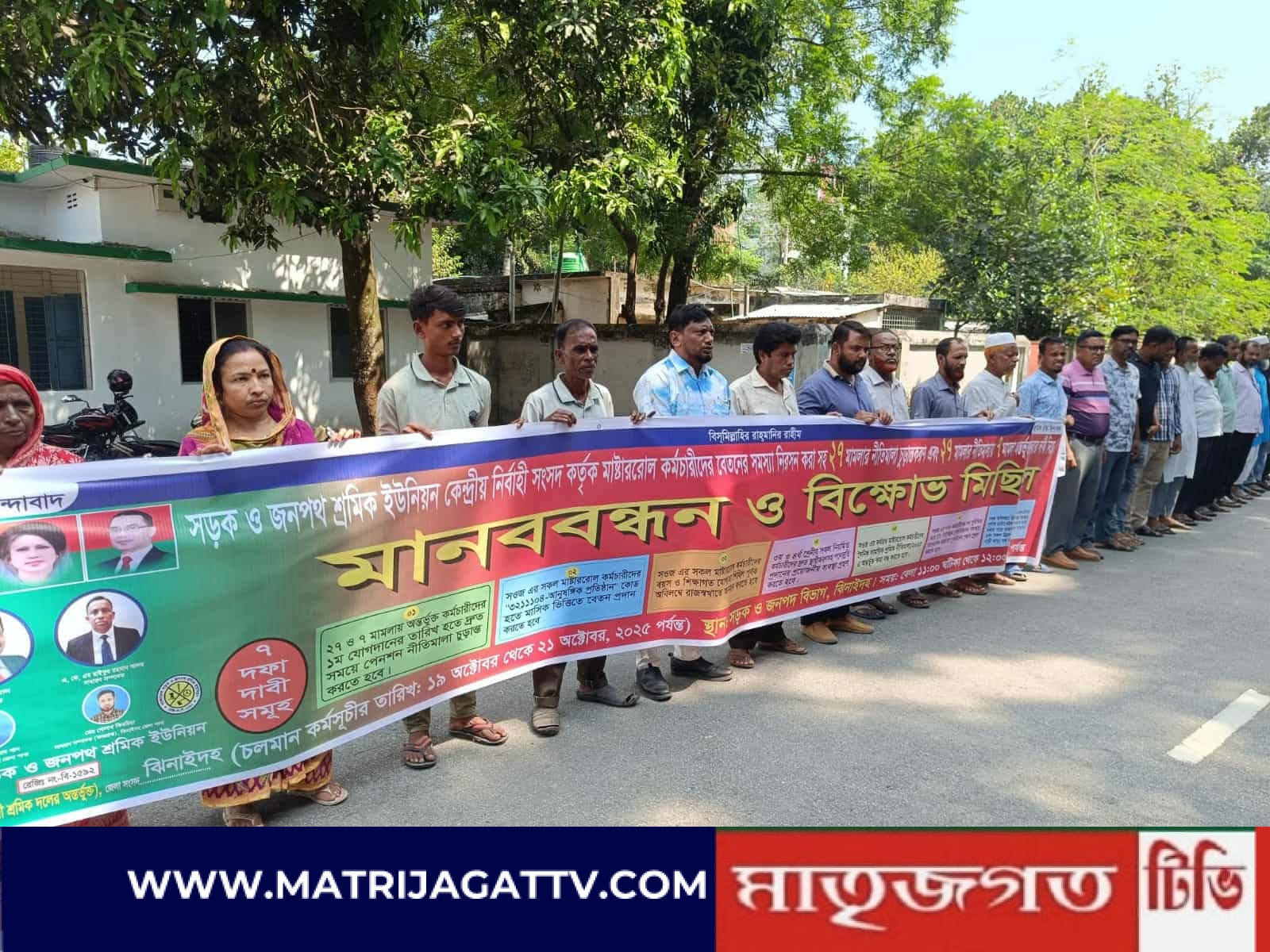 ঝিনাইদহে ৭ দফা দাবী বাস্তবায়নে মানববন্ধন ও বিক্ষোভ মিছিল করেছে সড়ক ও জনপথ বিভাগের কর্মচারীরা। সোমবার (২০ অক্টোবর) সকালে সড়ক বিভাগের সামনে শ্রমিক ইউনিয়নের কেন্দ্রীয় কর্মসূচীর অংশ হিসেবে মানববন্ধন ও বিক্ষোভ সমাবেশ অনুষ্ঠিত হয়।