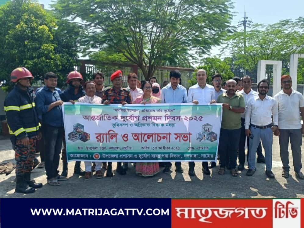 “সমন্বিত উদ্যোগ, প্রতিরোধ করি দুর্যোগ”—এই প্রতিপাদ্যকে সামনে রেখে নাটোরের নলডাঙ্গায় যথাযোগ্য মর্যাদায় পালিত হয়েছে আন্তর্জাতিক দুর্যোগ প্রশমন দিবস ২০২৫। রবিবার (১৩ অক্টোবর) সকালে নলডাঙ্গা উপজেলা প্রশাসন ও দুর্যোগ ব্যাবস্থাপনা বিভাগের আয়োজনে উপজেলা পরিষদ চত্বর থেকে একটি বর্ণাঢ্য র্যালি বের হয়ে প্রধান প্রধান সড়ক প্রদক্ষিণ শেষে একই স্থানে এসে শেষ হয়। র্যালি শেষে উপজেলা চত্বরে অনুষ্ঠিত হয় ফায়ার সার্ভিসের সচেতনতামূলক মহড়া। নলডাঙ্গা ফায়ার সার্ভিস স্টেশন অফিসার রুস্তম আলীর নেতৃত্বে একটি চৌকস দল ভূমিকম্পকালীন উদ্ধারকাজ ও অগ্নিনির্বাপণ কৌশল প্রদর্শন করেন। মহড়ায় স্থানীয় জনগণ, শিক্ষার্থী ও উপস্থিত অতিথিদের মধ্যে দুর্যোগ মোকাবিলায় আগ্রহ ও সচেতনতা বৃদ্ধি পায়। অনুষ্ঠানে সভাপতিত্ব করেন উপজেলা নির্বাহী কর্মকর্তা প্রিয়াংকা দাস। এসময় উপস্থিত ছিলেন উপজেলা প্রকল্প বাস্তবায়ন কর্মকর্তা হাসিবুল ইসলাম, কৃষি কর্মকর্তা কিষোয়ার হোসেন, বিভিন্ন দপ্তরের কর্মকর্তা, বীর মুক্তিযোদ্ধা, শিক্ষক, এবং প্রিন্ট ও ইলেকট্রনিক মিডিয়ার সাংবাদিকবৃন্দ। প্রতিবছর ১৩ অক্টোবর বিশ্বব্যাপী “আন্তর্জাতিক দুর্যোগ প্রশমন দিবস” পালিত হয়। এ দিবসের লক্ষ্য হলো—জনগণের মধ্যে দুর্যোগের ঝুঁকি হ্রাস, সচেতনতা বৃদ্ধি এবং প্রাকৃতিক ও মানবসৃষ্ট দুর্যোগ মোকাবিলায় সক্ষমতা ও প্রস্তুতি জোরদার করা। নলডাঙ্গায় আয়োজিত এ দিবসের কর্মসূচি দুর্যোগ মোকাবিলায় স্থানীয় জনগণের অংশগ্রহণ ও সমন্বিত উদ্যোগের গুরুত্বকে আরও একবার স্মরণ করিয়ে দিল।