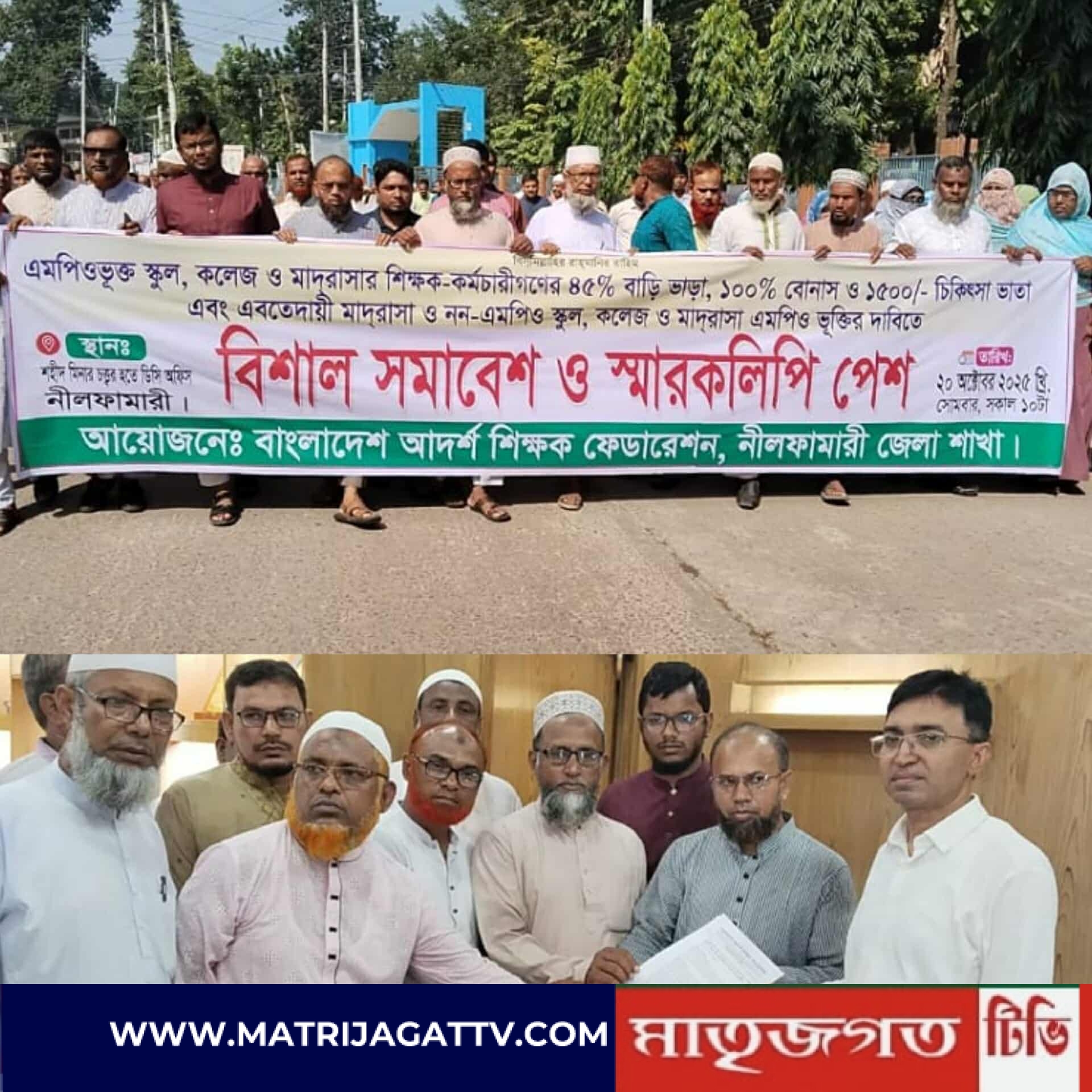 শিক্ষা সংস্কার, এমপিওভুক্তি, বকেয়া ভাতা পরিশোধ ও শিক্ষক-কর্মচারীদের জীবনমান উন্নয়নসহ পাঁচ দফা দাবিতে প্রধান উপদেষ্টার বরাবর জেলা প্রশাসক মোহাম্মদ নায়িদুজ্জামানের কাছে স্মারকলিপি প্রদান করেছে বাংলাদেশ আদর্শ শিক্ষক-কর্মচারী ফেডারেশন নীলফামারী জেলা শাখা।