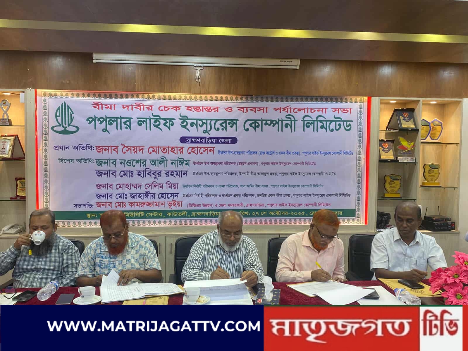 পপুলার লাইফ ইনস্যুরেন্স কোম্পানী লিমিটেড ব্রাহ্মণবাড়িয়া জেলার বীমা দাবীর চেক হস্তান্তর ও ব্যবসা পর্যালোচনা সভা অনুষ্ঠিত।