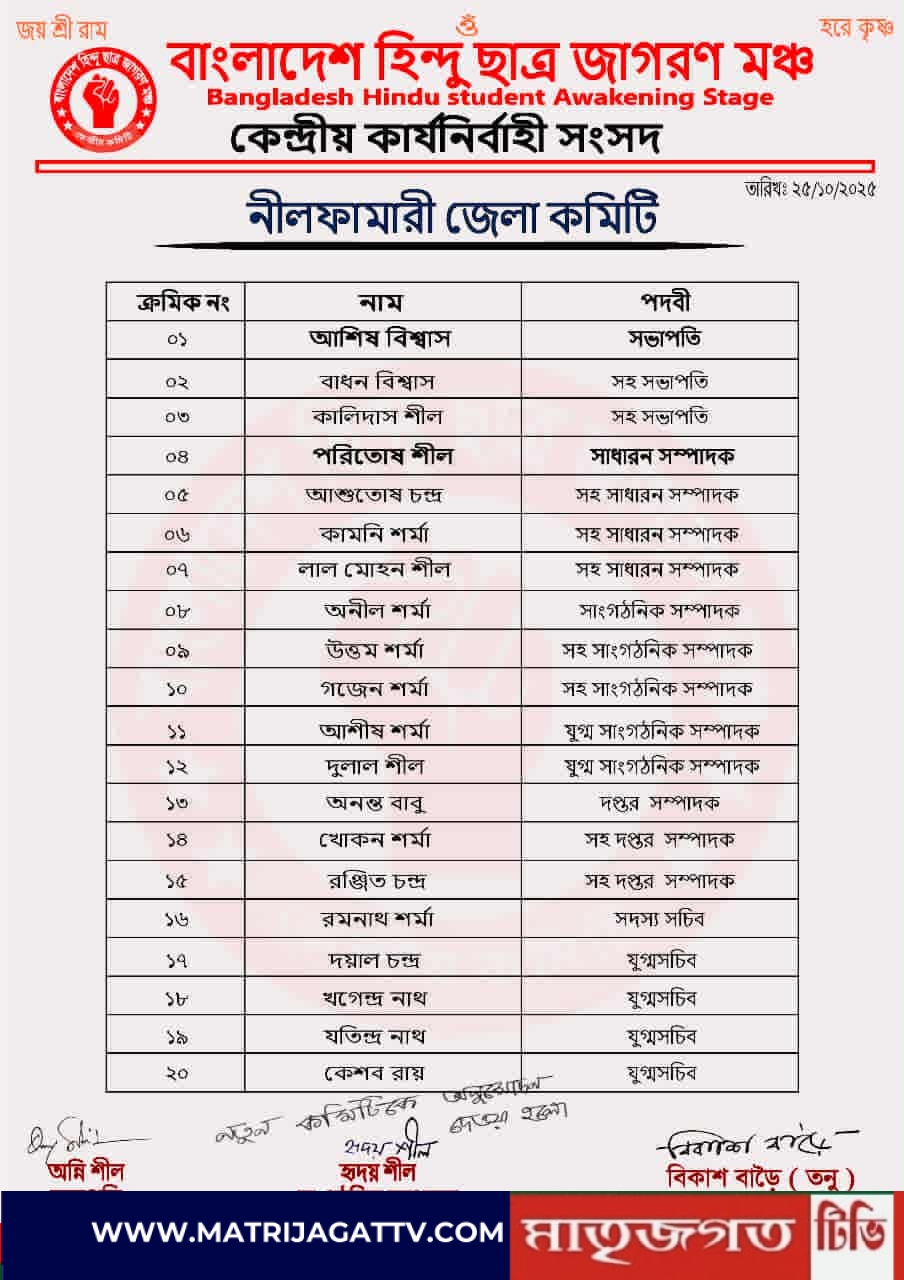 বাংলাদেশ হিন্দু ছাত্র জাগরণ মঞ্চের কেন্দ্রীয় কার্যনির্বাহী সংসদের পক্ষ থেকে নীলফামারী জেলা কমিটি অনুমোদন দেওয়া হয়েছে। এ উপলক্ষে সংগঠনের কেন্দ্রীয় কমিটির উপদেষ্টা শ্রাবন দাশ ও সভাপতি অন্নিশীল এবং সাধারণ সম্পাদক বিকাশ বাড়ৈ (তন্ময়) নীলফামারী জেলার নবগঠিত জেলা কমিটির সকল নেতৃবৃন্দকে আন্তরিক অভিনন্দন ও শুভেচ্ছা জানিয়েছেন।