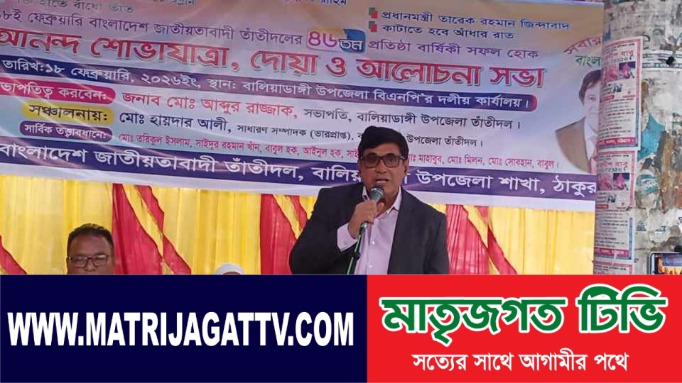 দেশনেত্রী বেগম খালেদা জিয়া চির অম্লান শক্ত হাতে বাঁধো তাঁত প্রধানমন্ত্রী তারেক রহমান জিন্দাবাদ কাটতে হবে আঁধার রাত এই স্লোগানকে সামনে রেখে বালিয়াডাঙ্গী উপজেলা তাঁতীদলের ৪৬ তম প্রতিষ্ঠা বার্ষিকী উপলক্ষে আনন্দ শোভাযাত্রা দোয়া ও আলোচনা সভা অনুষ্ঠিত হয়েছে