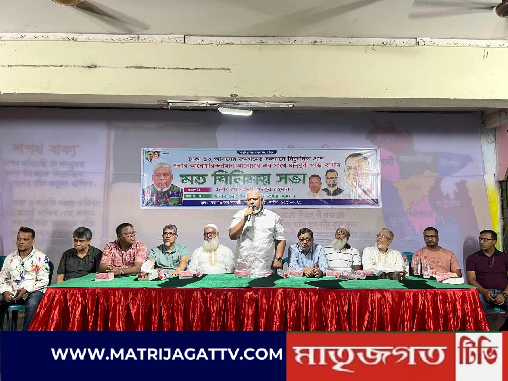 তেজগাঁও থানাধীন ২৭নং ওয়ার্ডের মনিপুরীপাড়ায় স্থানীয় বাসিন্দাদের সঙ্গে এক মতবিনিময় সভা অনুষ্ঠিত হয়েছে। সভায় প্রধান অতিথি হিসেবে উপস্থিত ছিলেন ঢাকা-১২ আসনের পরিচ্ছন্ন রাজনীতিবিদ, সাবেক কমিশনার এবং ঢাকা মহানগর উত্তর বিএনপির সাবেক যুগ্ম আহ্বায়ক ও বর্তমান জ্যেষ্ঠ সদস্য আনোয়ারুজ্জামান আনোয়ার।