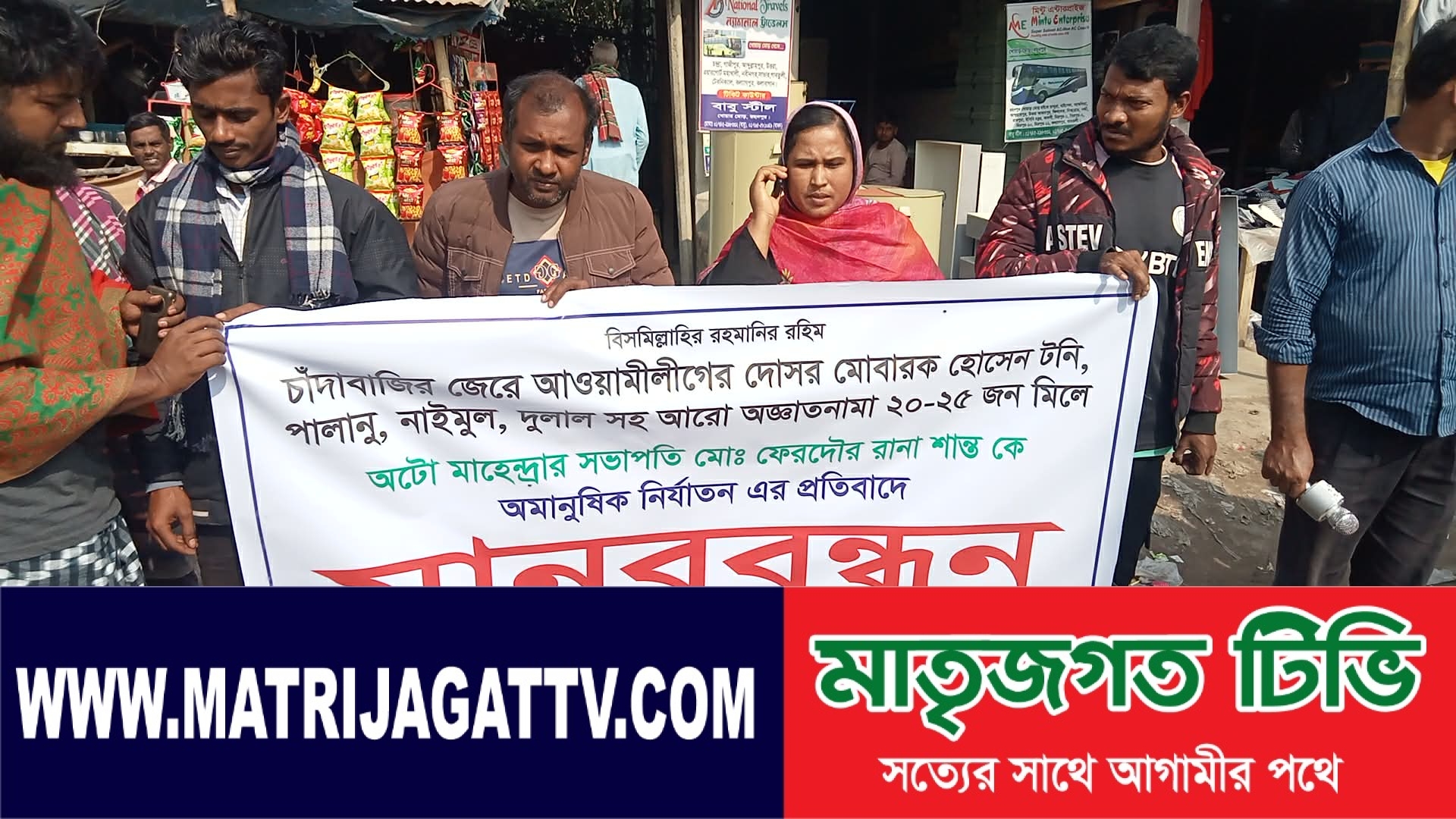রহনপুরে অটো ও মাহিন্দ্রা মালিক কল্যাণ সংস্থার সভাপতি ফেরদৌস রানা (শান্ত ) এর উপর হামলার প্রতিবাদের মানববন্ধন।