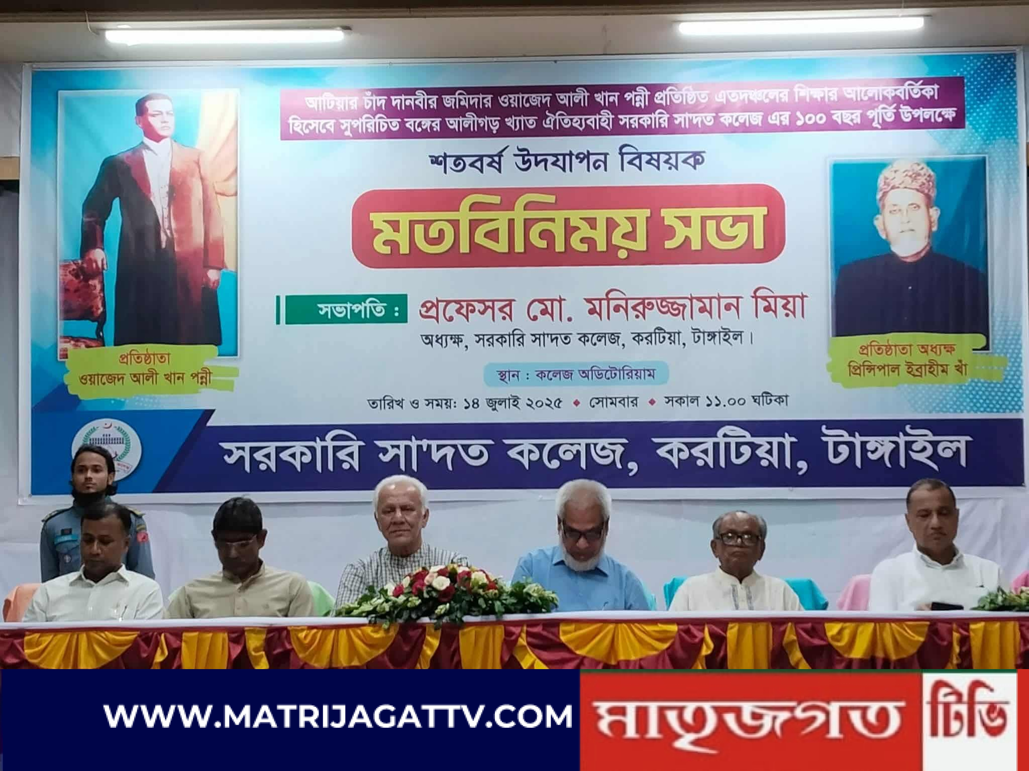 টাঙ্গাইলের সরকারি সা'দত বিশ্ববিদ্যালয় কলেজের শতবর্ষ উদযাপন উপলক্ষে মত-বিনিময় সভা ১৪ জুলাই সোমবার অধ্যক্ষ প্রফেসর মনিরুজ্জামান মিয়া সাহেবের সভাপতিত্বে,সহযোগি অধ্যাপক শেখ ফরিদ ও প্রভাষক শারমীন সুলতানার সঞ্চালনায় কলেজ অডিটোরিয়ামে অনুষ্ঠিত হয়।মত-বিনিময় সভায়