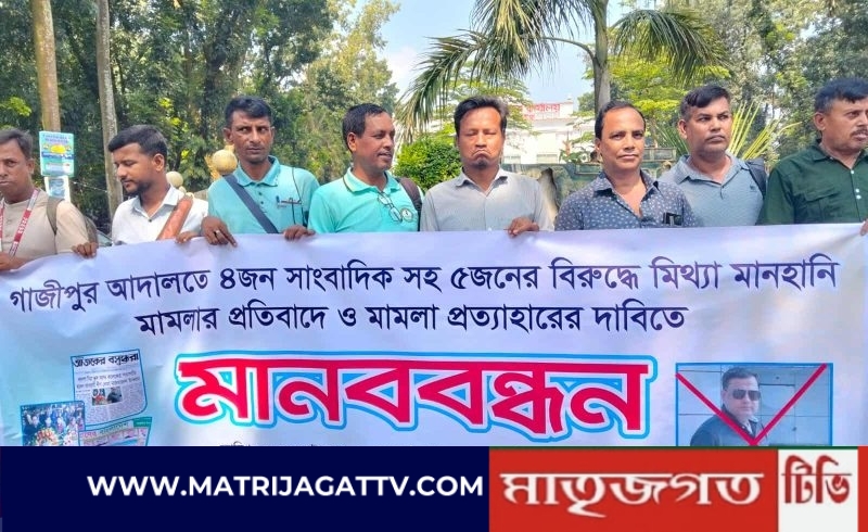 গাজীপুর আদালতে ৩ সম্পাদকসহ ৫ সাংবাদিকের বিরুদ্ধে মানহানি “মিথ্যা” মামলার প্রতিবাদে মানববন্ধন