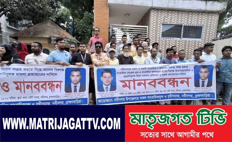 নবীনগরে দুই সংবাদকর্মীর বিরুদ্ধে মিথ্যা মামলা প্রতিবাদে মানববন্ধন